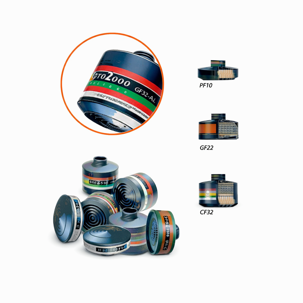 Applicazioni: gas e vapori inorganici, es. cloro, solfuro di idrogeno e acido cianidrico, fluoro, cloruro cianogeno, fosgene e particolati solidi e liquidi, radioattivi e tossici, microrganismi. - CF 32 K2-P3