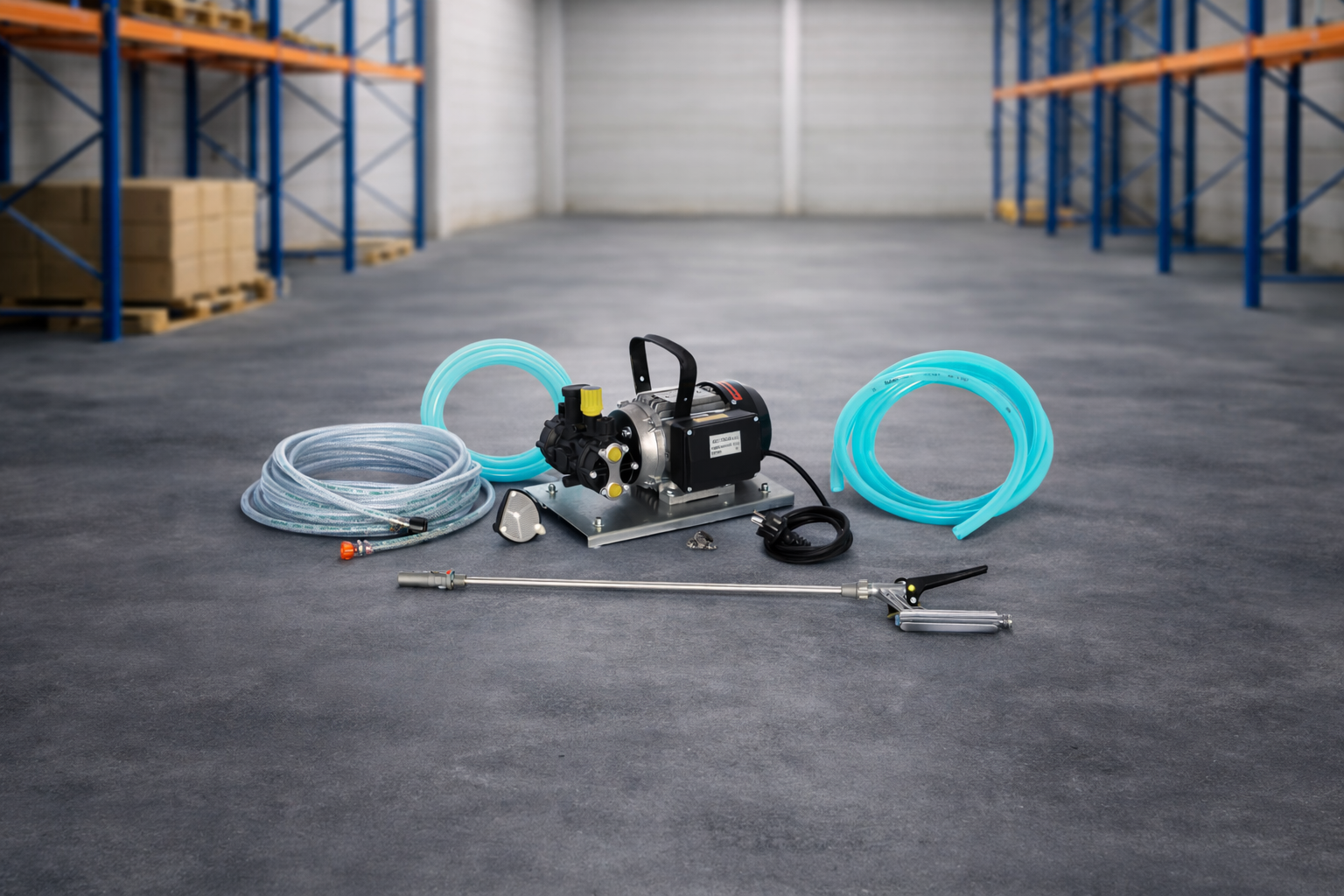 Tubo flessibile in PVC e lancia composta da impugnatura a leva in plastica, prolunga alluminio, ugello regolabile da spruzzo a rosa o a getto lungo.
