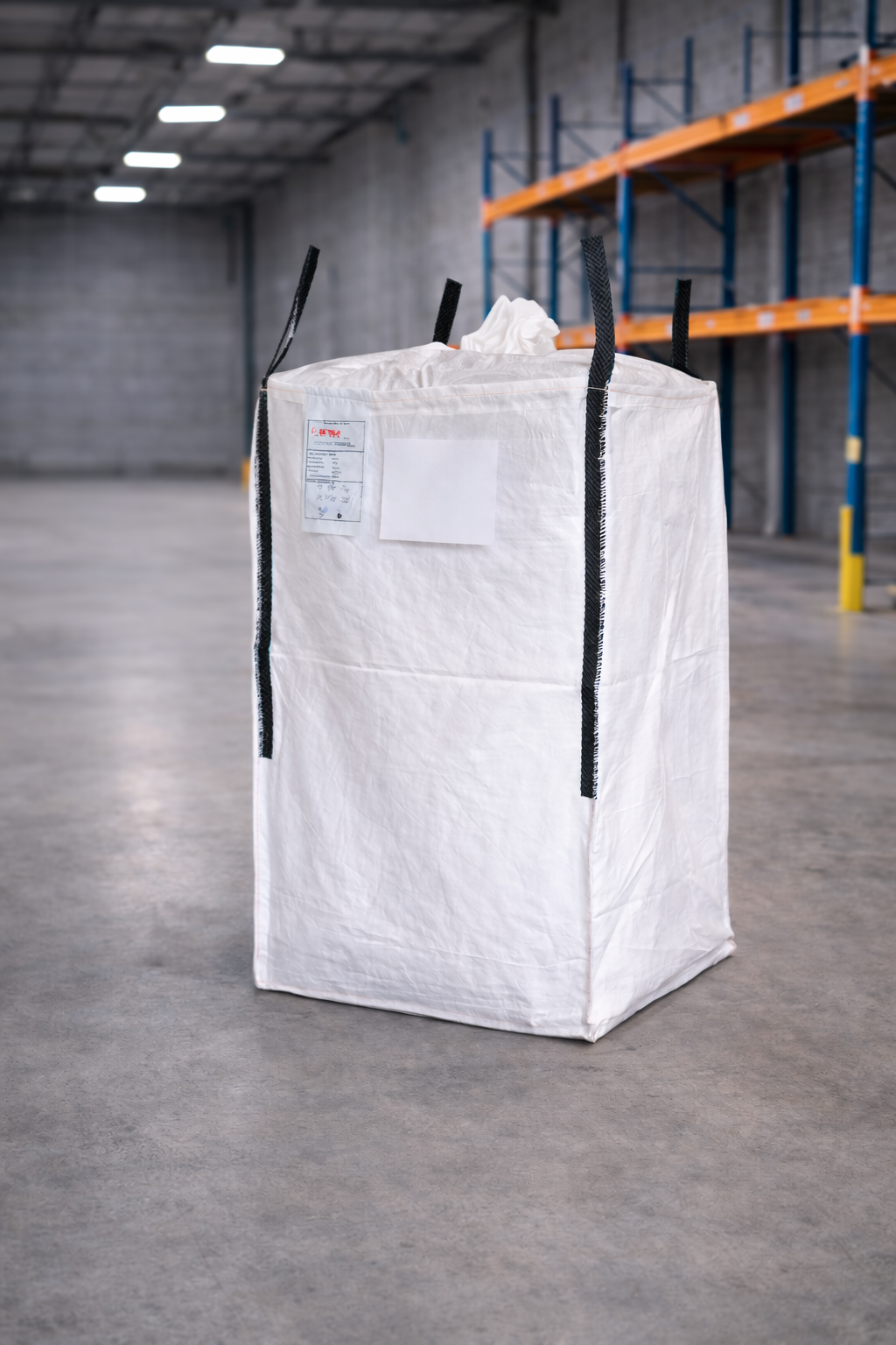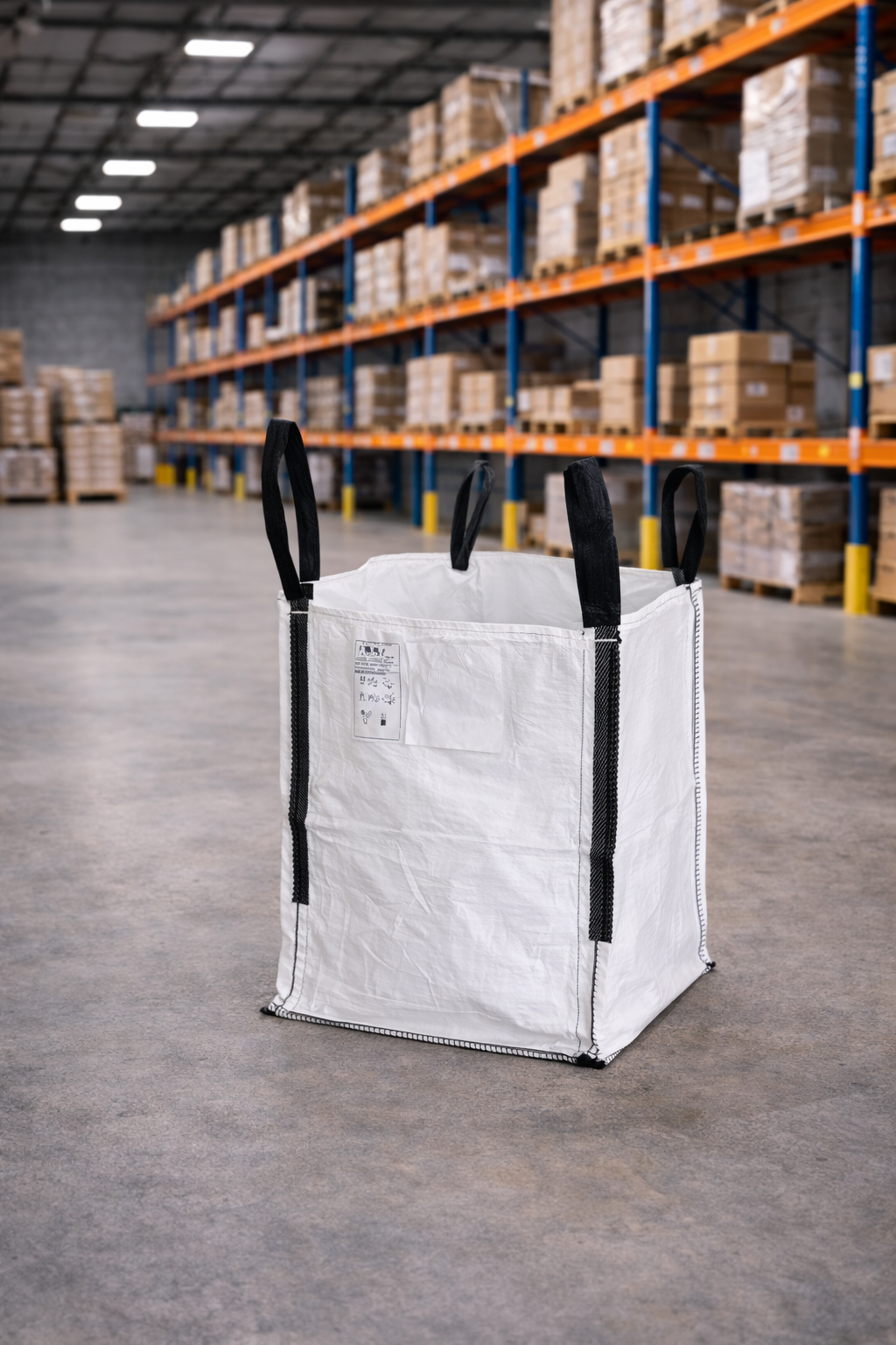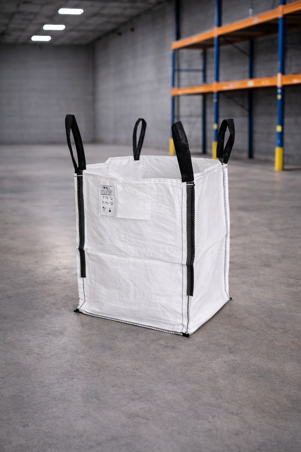 Misure esterne 90x90x100 cm Tessuto 150 gr/m2 Portata 1.500 kg Carico Cielo aperto Cuciture Standard Fondo Piatto chiuso Sollevamento 4 bretelle 40 cm rinforzate Bretelle Angolari Costruzione U+2 -